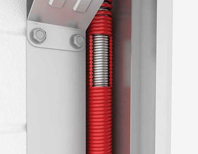 Bramy segmentowe wyposażone obustronnie w mechanizm ocynkowanych sprężyn skrętnych posiadają zabezpieczenie przed pęknięciem sprężyny. W razie ewentualnego pęknięcia sprężyny zabezpieczenie natychmiast zatrzymuje bramę, płyta nie opada. Mechanizm ten jest przeznaczony do instalacji w dużych otworach garażowych o wyższym nadprożu.
